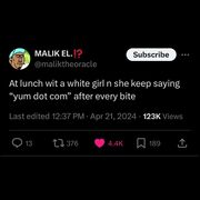 | 18:02, 27 March 2026 | At lunch wit a white girl n she keep saying "yum dot com" after every bite.jpg (file) | 54 KB | Jorb (talk | contribs) | MALIK EL.!? @maliktheoracle Subscribe At lunch wit a white girl n she keep saying "yum dot com" after every bite Last edited 12:37 PM • Apr 21, 2024 • 123K Views ... 13 L7 376 4.4K 189 1 | 1 | |